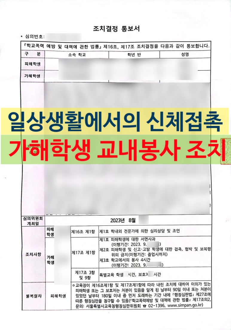 '교내봉사'(학교폭력예방법 제17조 제1항 제3호) 조치를 받게 되었습니다.